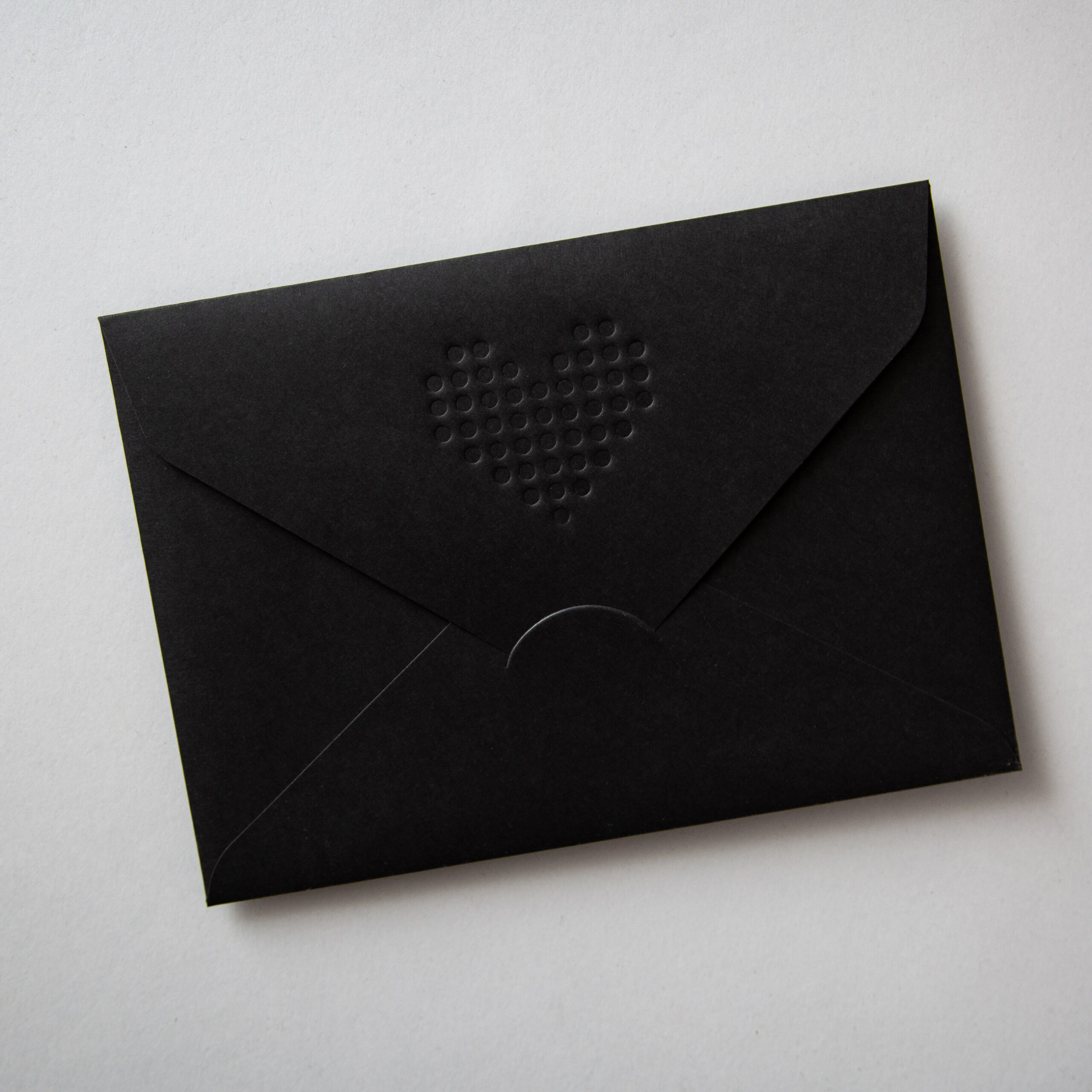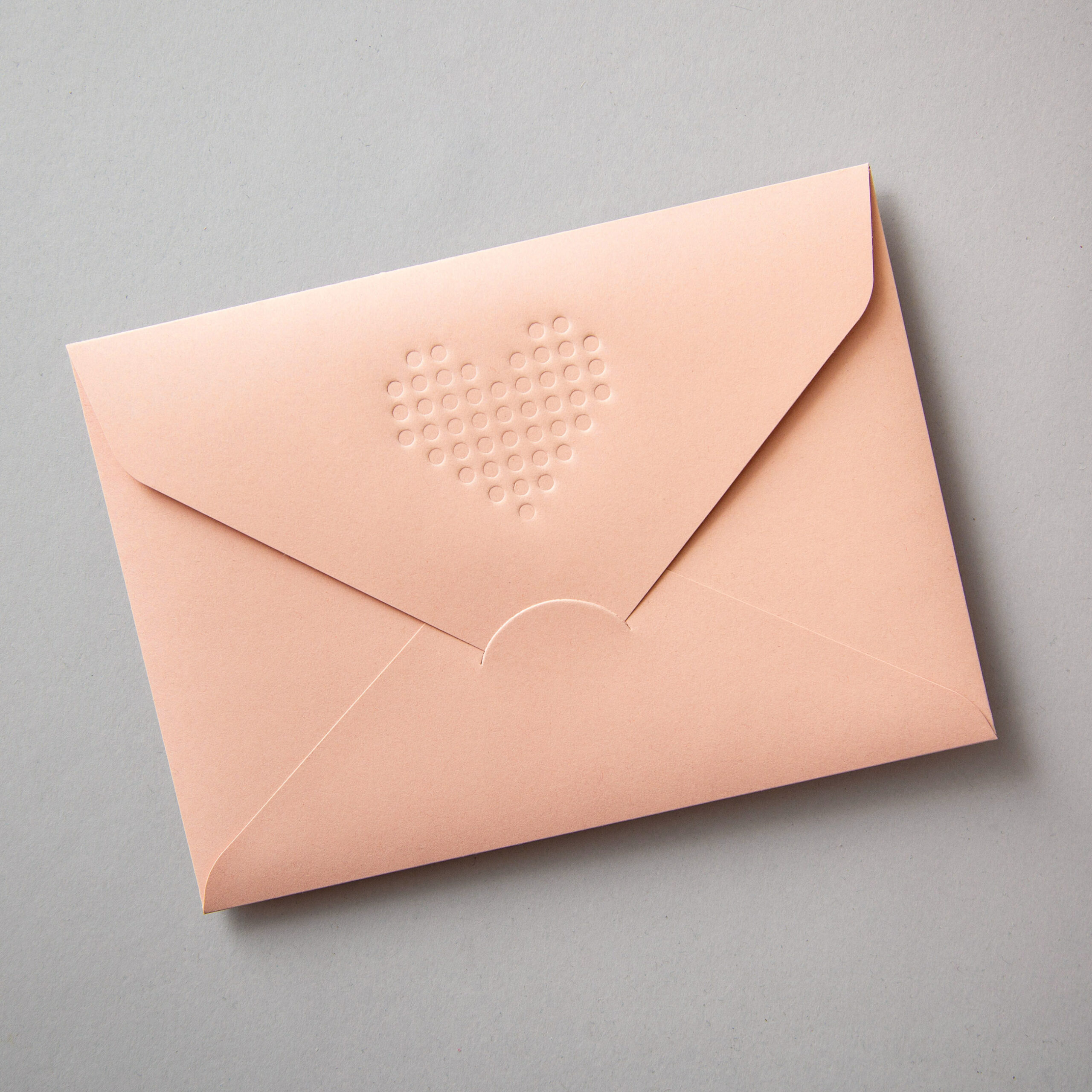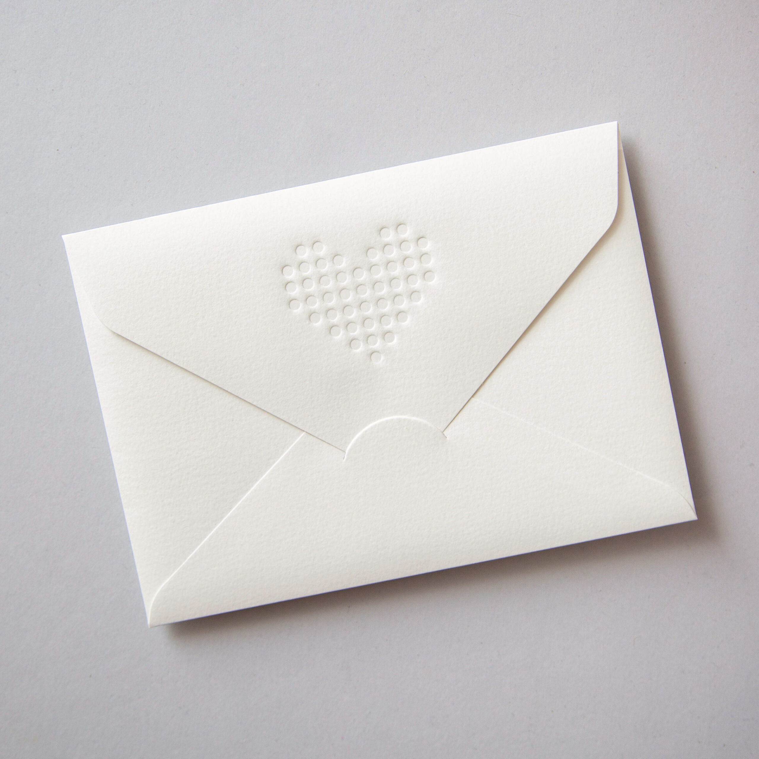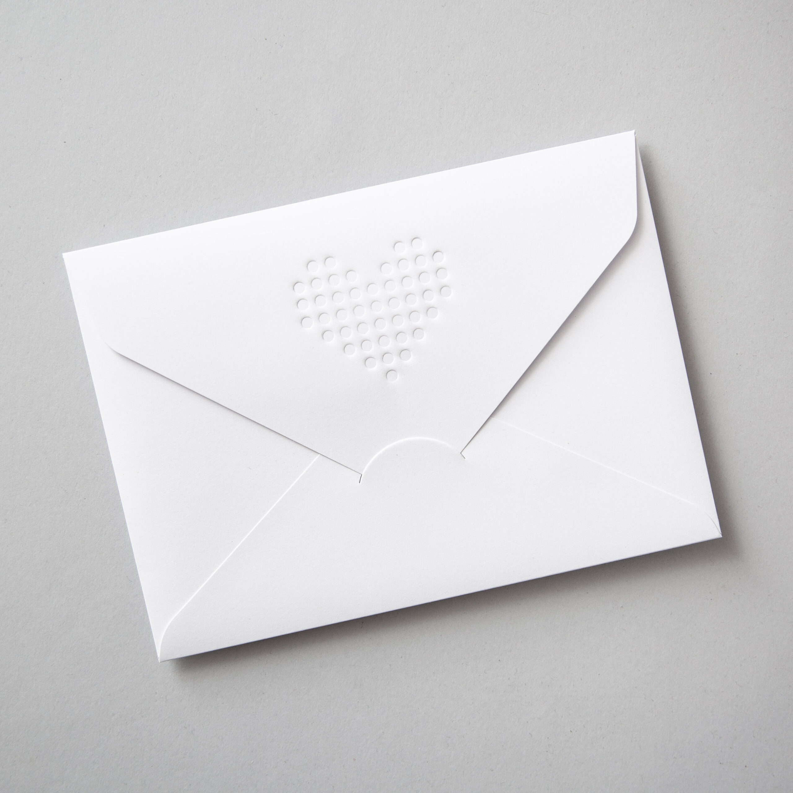 Kuverta za pozivnice za vjenčanje formata 13*18 cm s tipskim slijepim tiskom motiva srca. Kuverte su dostupne u bijeloj, maslinasto zelenoj i 7 drugih boja.
